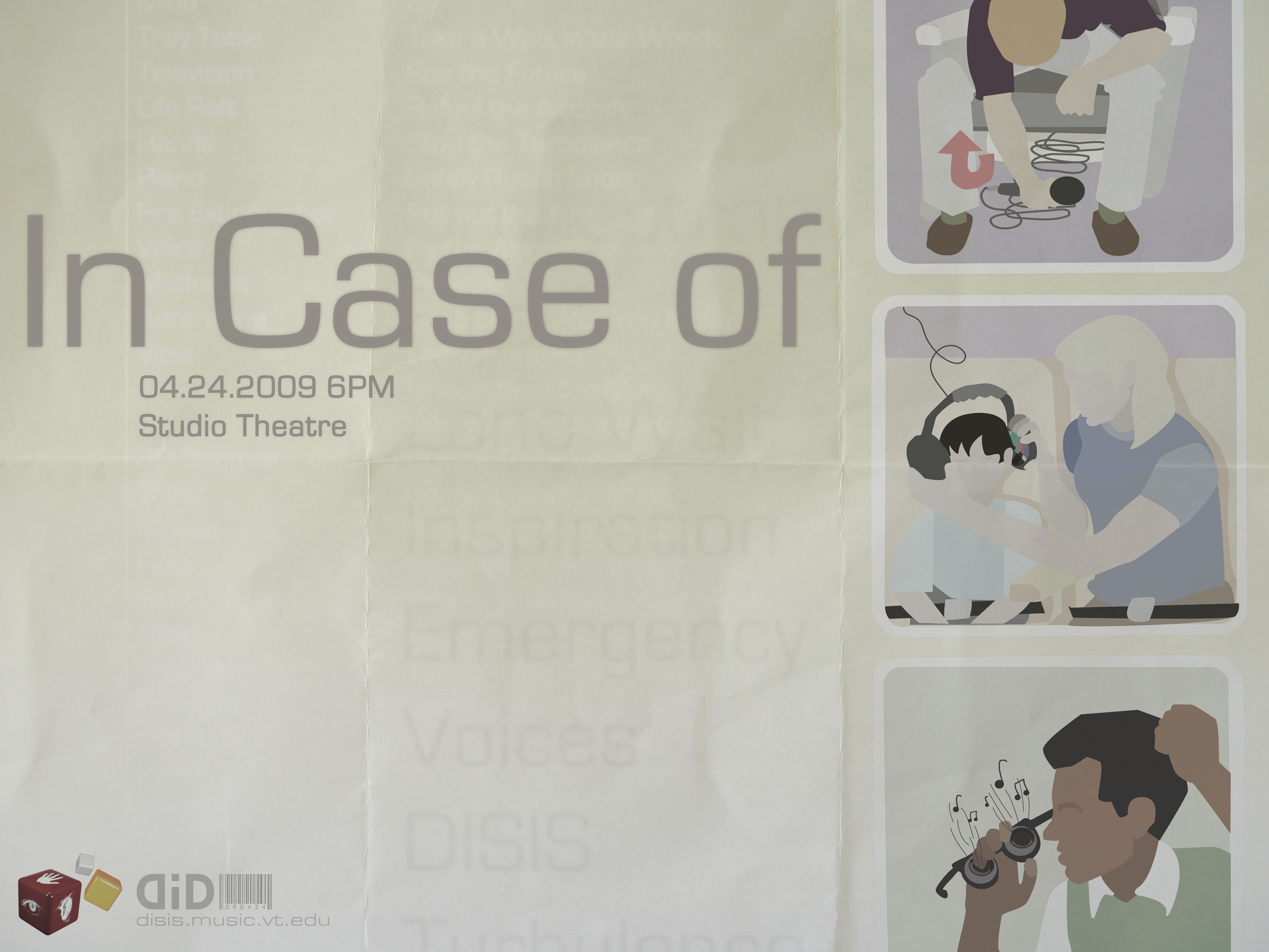 --Wassily Kandinsky DISIS presents "In Case of " Digital iD Performance Event - 6:00 pm, Friday, April 24th, 2009 - Squires Studio Theatre As part of the Arts Fusion festival, VT Music Department's Digital Interactive Sound and Intermedia Studio (DISIS) in conjunction with the School of Performing Arts and Cinema (SOPAC) and Collaborative for Creative Technologies in the Arts and Design (CCTAD) hosts its 3rd annual performance event featuring visiting international artist Tibor Varszegi, Sue Ott Rowlands, DISIS founder and director Ivica Ico Bukvic, and a collection of works by DISIS students. Through the pursuit of new forms of artistic expression DiD series have evolved into a unique amalgamation of music, creative technologies, visual arts, theatre, and performance. This year's event will be also accompanied by the latest artwork by Merce Cunningham titled "Dancers III." |
