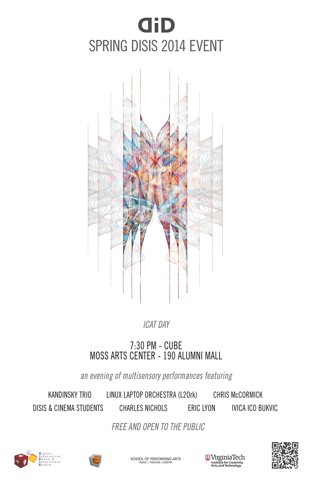 --Wassily Kandinsky DISIS presents Digital iD Spring Event - Monday, May 5, 2014 - Moss Arts Center Cube As part of the ICAT Day, VT Institute for Creativity, Arts and Technology (ICAT) and School of Performing Arts' Digital Interactive Sound and Intermedia Studio (DISIS) presents its Spring Showcase, a part of the "Digital iD" performance series featuring an evening of multisensory performances that fit no preexisting form or template. The event will feature the Kandinsky Trio and guest artist Chris McCormick, Virginia Tech faculty artists Ivica Ico Bukvic, Lee Heuermann, Eric Lyon, and Charles Nichols, Virginia Tech's Linux Laptop Orchestra (L2Ork), and students engaged in the DISIS and Cinema curricula. Also on the concert is a performance of Terry Riley's "In C," played telematically between musicians at Virginia Tech and Stanford University. Using JackTrip software, the two schools will stream audio across the continent, allowing the distributed musicians to perform together in real time. "Digital iD" offers an exploration of synergies among music, technology, arts, gesture, collaboration, interactivity, and ultimately community. The event is free and open to the public. Facebook Page |